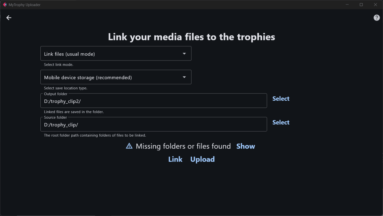 Once linking is completed, if any game folders or files are missing, the ‘Show’ button will appear. By clicking this button, you can review the missing items. To upload your trophy data to MyTrophy, click the ‘Upload’ button.