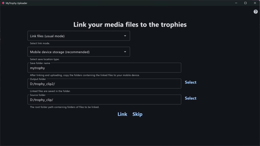 Select your output folder and source folder, then click the ‘Link’ button. If you don’t need to link them, you can skip this step by clicking the ‘Skip’ button. The Save folder name is the name of the folder where files are saved on your mobile device.  The output folder is where the linked files are saved. The source folder contains the game-related folders with screenshots and clips captured when a trophy is obtained. In this example, we select ‘trophy_clips2’ folder as output folder and ‘trophy_clip’ folder as source folder.